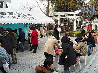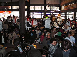 今日はお日様も照りながら、小雪も舞っています。 各教会も節分のお祭りが、1日(日)から今日の夜にかけて行われていることで しょう。 自称・他薦の特派員の皆さん、写真と原稿を御願いします。 1月31日の大旗の竹竿取りは、総代世話人と神理の会など21人も参加頂き、お 陰で早くに終わることが出来ました。 2月1日は一年で一番寒い月例祭が、管長様を祭主に6:00から行われました。 それでも食事の後、大祭の打合せなどがあり、全員が帰られたのは午後3時過ぎで した。 無理を御願いしている式年整備奉進金もお陰で段々と集まっていますので、大教殿 の式殿に続き拝殿も畳替えと下張りの工事が出来そうです。 ・行事予定 1)2月9日(月)は大元稲荷の初午{はつうま}のお祭りがあり、いつも地方から も参拝頂いています。 2)2月16日(月)は11:00から教祖生誕祭です。 生誕170年となる記念のお祭りですから、多数のお帰りをお待ちします。 ・2月14・15日(土・日)は未来委員会と青年部の合同会です。 <節分・大星祭 枝光教会> 枝光教会は、本院から30分くらいのところにあります。 2月3日(火)の今日11:00から、神理教枝光教会で標記の祭りを行いまし た。 巫部が祭主・福馬カヲル教会長・波多野捨子教師・本院の古川教師の奥さん古川雅 子教師の4人で奉仕しました。 式の次第は、祓詞・祓行事・教祖神拝詞・大星祭祝詞・大祓6巻・記念詞です。 祭主が大祓を他の祭官と参拝者で奏上する間に、教会長が祈願者の名前と年齢を読 み上げる、というものです。 大祓6巻はとても長く感じますが、以前は12巻奏上していたそうです。 枝光教会の豆まきは袋などに入れず、昔ながらの直まきです。 衛生?関係ありません。 昔からこうして適当にばい菌を体の中に取り入れ、抵抗力を付けたのです。 あるべきばい菌が体にあるからこそ、アトピーや花粉症にならないのだと聞いたこ とがあります。 祭典終了後、参拝者一人ひとりに祈願の御札を授与し、祭主の挨拶があります。 お話は教祖の御歌3首、を通じてお取り次ぎをさせて頂きました。 手作りのおすまし汁やおいしい五目ご飯を頂き、本院の祭りに間に合うよう少し慌 てておいとましました。 <節分・大星祭 本院 昼の部> お昼の部は夜に比べて少ないのですが、それでも教殿が一杯になりました。 ここではお話などとても出来る雰囲気ではありませんが、夜の部に比べると子ども の年齢層も低く、穏やかにそして楽しい雰囲気の中で行われました。 夜の部はどうなることやら。 |