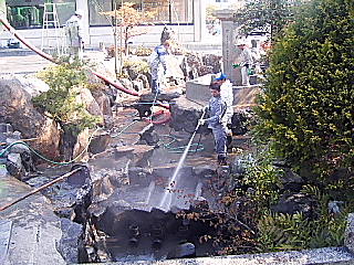 満開の桜がどんどん散って行きます。 散っても散ってもまだ散る桜の花びらにまみれるようにして、暖かい春の日差しの 下で沢山の教会の皆さんが神前奉仕にいそしんで下さいました。 きっと大きな御神徳をいただかれて帰途に着かれたことと思います。 お疲れ様でした。 筆者はお祓いが続き、取材がままなりませんでしたが、夕方お帰りの方の見送りを させて頂きました。 最近、コンピューターウイルスがたくさん送られてくるようです。 神理教のパソコンはホストサーバーを通じて送られてくるので、もしウイルスが付 いていた場合、そこで止められ内容を見ることが出来ません。 20数通のメールが止められた、と連絡を受けました。 何か大切な話をメール下さる場合、届いてないと思われたら、電話かFAXなどでお 知らせ下さい。 感想やご自分や教会の様子のご報告など、投稿もお待ちします。 午後から巫部・瀬戸・渡辺・立元・古川・大野・末若で、造化大神宮・大元稲荷神 社・大教殿・教祖殿の内陣を中心にお掃除をさせて頂きました。 境内の様子は、ほぼ大祭モードです。 >行事予定< 毎月1日6:00より月例祭、16日16:00より教祖祭 1)4月12日(月)は、教派連の理事会。 2)4月16〜18日(金〜日)は、独立110周年式年大祭 3)5月1日(土)は、枝光教会の春季大祭。 1.<稲荷宮(大分県)教会の清掃奉仕> 4月9・10日(金・土)は、大分県九重町組と福岡市組の両方から帰院頂きまし た。 教祖の墓前や地主社周辺などの清掃をして頂きました。 2.<福山教会(広島県)の清掃奉仕> 4月9〜11日(金〜日)は、バスや自家用車で58名の団体でご奉仕頂きまし た。 4日(日)の教会の大祭に引き続きのご奉仕でした。 まずは池の泥あげから始まり、徳力山の清掃から札所の飾り付け、お茶席の準備、 テントや神理会館の食堂の準備など、精力的にこなして頂きました。 3.<地元(本院)の幟(のぼり=大旗)立てと遙拝式の準備> 4月10日(土)は、地元総代会による幟(のぼり)立てと、地元神理の会による 遙拝式の準備がありました。 幟は、天在諸神(青)・教祖明星大神(青)・大元稲荷(赤)の大旗が100本以 上立ちますから、とても勢いを感じます。 遙拝式の準備は、紫川の河原で行われます。 石だらけだった河原が、最近整備されたので足元はしっかりしましたが、杭を打つ のがやってみないと分からない、ということでした。 神理の会には造園会社の方も何人か居られるので、重機や柵などお借りでき大変助 かります。 4.<道しるべ・添田分(福岡県)教会の清掃奉仕> 4月11日(日)は、両教会で大駐車場や徳力山の参道をご奉仕頂きました。 掃いても掃いても、桜の花びらはまだよいものの、新緑を目前に古い葉が風も吹か ないのにドサドサバランと落ちてきます。 5.<枝光(福岡県)教会の清掃奉仕> 4月11日(日)は、枝光教会の皆さんが納骨殿の周囲や教祖殿の中など清掃奉仕 頂きました。 5月1日(土)には、教会の春季大祭があり、巫部が出向します。