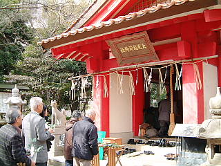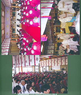 | 初午祭 平成16年2月9日(月) 二月最初の午の日を祝う「初午祭」が、九日十一時から大元稲荷神社で行われました。 強い寒波が通り過ぎ、まだ風は強いものの、厳しい寒さは緩んだこの日、熊本・長崎・広島・岡山・香川・愛知など、遠方からも多くの皆さんが参拝。拝殿に入りきれないほどでした。 二月の初午を稲荷の縁日とする由来は、伏見稲荷大社の祭神が稲荷山に降臨したのが和銅四年(七一一年)二月十一日で、その日が初午だったという言い伝えによります。ただし、その真意は定かではありません。 「『いのりなば かならずしるし あるものを なしと思うは 心からなり』という御教祖様の御歌があります。これは、祈れば必ずおかげがある。しかし、そうしたことを受け止める心がけのない人には、おかげはない。 ないと思うのは、その人の心がけが悪いからだ、という意味です。私たちは、いろいろなおかげをいただいていますが、それに気付かずに過ごしてしまうことが多いようです。そして、ついつい不満や不足に心が傾いてしまうのです。最近、若い人が問題や事件を起こすことがよくありますが、彼らには自分がどれだけ見守られているかという認識が足りないのではないでしょうか。 神様の御徳に対して、崇め尊ぶという心が、祈るということに通じるのです。『わが心清々し』という心で祈れば、おかげがいただけます。必ず祈れば、しるしがあります。それに気付く心を養い、不足ではなく、感謝の中で新しいものを求めていただきたいと思います。」 最後にくじ引きがあり、景品として野菜や果物、餅、鯛などのお供え物が、強運の持ち主に渡されました。 山を下りた参拝者の皆さんは、このあと、直会に参加。和やかなひと時を過ごした後、それぞれ帰路につきました。 節分・大星祭 平成16年2月3日(火) 二月三日、大教殿で節分の大星祭が行われました。昼の部は午後三時から、夜の部は午後八時から。時折、小雪の舞う寒い一日でしたが、昼の部、夜の部ともに大勢の参拝者がありました。 夜の部の開式十五分前。「夜八時の節分祭は恐いという評判がありますが…」と、切り出したのは瀬戸局長。事前に、神前でのマナーや、参拝者の皆さんに豆をまく本来の意味などを説明します(暗に「慌てず騒がず、冷静に振舞って下さい!」とお願いしているわけです)。そして、玉串拝礼の時に参拝者も一緒に行う作法を説明して、みんなで練習しました。 寒さが一段と厳しくなる中、続々と集まってくる人、人、人! 「恐い」という噂の意味が、ようやく分かってきました。やはり、目立つのは家族連れの姿です。皆、手に袋を持ち、かなり気合いが入っています。いつの間にか、大教殿に入りきれず、外で立っている人もいるほど、参拝者の数は膨れ上がっていました。 祝詞奏上の後、年男・年女と厄年の男女の代表二名による玉串拝礼、参拝者の玉串拝礼と続き、いよいよ豆まきの始まりです。 大教殿の灯が消され一瞬、真っ暗に。再び明るくなった時には、どこからともなく鬼が現れていました。そして、年男・年女、厄年の男女が一斉に豆をまき始めます。参拝者全員に行き渡るようにと、前から後ろから、まんべんなくまきますが…、あっという間に用意された豆やお菓子など全てが、参拝者の用意した袋の中に消えて行きました。 それにしても、大教殿に子どもたちの元気な声が響き渡る様子は、活気があって、とてもいいものです。教信徒ではない皆さんが多いということですが、これを機に神理教とのご縁が始まる方もいらっしゃるのではないでしょうか。 ちなみに、この日、用意された豆は全部で一万袋! 職員の皆さんが大雪の日に二日間かけて袋詰めして下さったそうです。ご苦労様でした。 ![]() 子どもの頃は、よく節分祭に来ていましたが、今年は大厄なので、厄払いの意味も込めて参拝しました。 すると、受付でいきなり「年男・年女、厄年の代表として玉串拝礼をして下さい」と指名されてしまって(笑)。 私が来た時には、まだ参拝者の数は少なかったんですが、しばらくして後ろを振り返ったら、参拝者がびっしり。びっくりしましたね。 豆は、まんべんなくまきたいと思ったものの、いざ始まってみると、とてもそんな余裕はありませんでした。十秒くらいでなくなってしまったでしょうか(笑)。皆さんに、ちゃんと行き渡っていたらいいんですが。 教祖生誕祭 生 誕 百七十年 去る二月十六日、教祖生誕祭が行われました。今年は御教祖がお生まれになって、ちょうど百七十年。当日はそれを祝うように好天に恵まれ、小春日和となりました。 まず本院の教祖殿で執り行われた神事は、清新で厳かな空気のなかにも、どこかやわらかい雰囲気。玉串拝礼のあと、斎主である渡辺斎先生が、独立を請願するために御教祖様が上京されたときの様子を交えながら、講話を行いました。 御教祖様は布教を兼ね、たったお一人で信濃路を往かれました。大雪のなかをわらじ履き。
