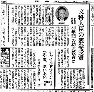柳二郎財務局長、文科大臣表彰 本教の財務局長でもある、津山教会の柳二郎教正が、文科大臣表彰を受けられました。津山教会は、学校法人明星学園・明星幼稚園を五十年にわたり運営しています。この度は柳教正の長年の教育と、市や県はもとより、日本全体の幼稚園の団体への貢献を表彰されたものです。 皇居にて天皇・皇后両陛下から柳ご夫妻同伴で表彰行事が行われたとのことです。お祝いを申し上げると共に、津山朝日新聞に掲載されたものを転載します。他にも朝日・山陽新聞に掲載されました。 誠におめでとうございました。春季式年大祭の弾みになればと祈ります。 |
