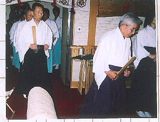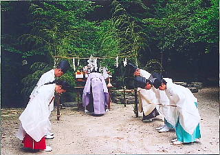 大祓・焼納祭 平成16年6月30日(水)11時〜・13時 いつも雨に見舞われてしまう大祓・焼納祭ですが、この日は真夏を思わせるほどの快晴となりました。数年ぶりに滝場での儀式も行われ、水の流れる爽やかな音と蝉の鳴き声が交差する中、大祓の祈念詞があげられました。自分の悪い箇所を書いたり触れさせたりした形代(人や車、バイクの形もあります)を清め、その後は燃やして供養するのですが、昭和四十年頃までは、形代をそのまま紫川に流していたそうです。 川に流すことができなくなってからは、滝場で清めた後、古い御神符などと一緒に焼納しています。 そもそも大祓とは、いにしえの昔、天皇が国民のために始められたもので、神理教だけでなく全国の神宮などでも同日に行われている神事です。 日本人は一年を六月までの上半期と、十二月までの下半期に分け、それぞれの期末(六月末と十二月末)に半年ずつのお祓を行い、罪や汚れを清めてきたのです。 十三時より行われた焼納祭では、御神酒と塩で清めた形代などを、五色の折り紙で作った贖物(全世界の罪を代わりに償う生け贄のような意味合い)と一緒に大教殿前にて焼き払いました。 大祓・焼納祭に参加して、もう一年も半分が過ぎてしまったんだな、としみじみ感慨深くなると共に、残り半年も頑張っていこうと、身の引き締まる思いがしました。そして生活していく上で、こうしたけじめのような行事は大事だなと、再確認できた一日となりました。 |