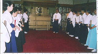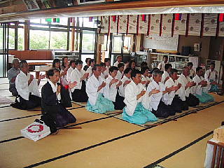 | 第24回 短期出張講習会開催 福山教会 特派員 兼 祭典部長 小林 隆 平成五年二月にスタートしたこの出張講習会も、回を重ねること二十四回を迎えました。毎回ご多忙の中、信者の為また教師の為に講義、祭式等の講師を務めて頂いております巫部祐彦副管長様と瀬戸正和宣教局長様に紙面を借りて、心より御礼申し上げます。 この講習会の目的は、@教師の資質の向上A厳粛かつ適正な祭典の執行B本院の先生方との交流等を主眼としており、年二回(二月と六月)開催しております。 今回は六月十九日(土)、二十日(日)の二日間、延べ五十名参加の下、実施されました。それでは、詳細について報告致します。 土曜日快晴。朝十時、十六名で教会三階の会場設営開始。 十時三十分、副教会長が副管長様と瀬戸先生を松永駅に出迎え。教会へ到着され、二階神前にて先生方御神拝の後、教会長以下教師、信者と懇談。 二ヶ月ぶりの再会にも話も弾み、あちこちで笑顔や爆笑。和やかな雰囲気で昼食会場へ。食事をしながら、本院「式年大祭」の思い出話、苦労話に花が咲きます。 ![]() 午後一時御神拝。先達、祓行事、太鼓、摺鉦、笛。これらの所役は教師が交代で務めます。終了後、三階で講義。講師は副管長様。はじめに「副管長職就任の挨拶」、次に自ら初めて出版された著書「かがやき」のご説明。内容は「神理雑誌」の「自然の道」を纏めたもので、皆様是非ご一読されることをお勧めします。そして「火水の巻・人体本言考(神理の声)・暗夜の灯台の比較研究」について、資料を交えながら、丁寧かつ明快な解釈で講義されます。資料を受講者が順番に読み上げていくので、うかうかしておれません。いつも感じておりますが、副管長様の講義は「優しさと誠実さ」が随所にあふれております。 午後三時半。講師は瀬戸先生。「大祓詞の信仰」について講義して頂きます。 「夏越祭」「芽の輪」の説明。「蘇民将来と巨旦将来」のお話。「祓い」について詳細な説明。そしてメインの「五元」の解釈など盛沢山。事前の準備方よろしく説明書をパソコンで作成され、黒板に貼り付けて、迅速かつ的確に説明されます。突然指名されて質問が飛んでくるので、受講者はピリピリ。居眠りなんて出来ません。時折ユーモアを交えて話を進められるので、その時ばかりは会場は大爆笑。 午後五時、夕食。教師による「食前の言葉」「食後の言葉」。そして暫しの休憩時間。 午後六時。講師は副管長様。講義内容「神理教 御教誡」。 本教の基本となる教です。新任の教師も六名参加しておりますので、おさらいの意味を込めて講義して頂きました。教会では月例祭の中で、教師が「本教大意」と共に奉読しております。 午後六時五十分。講師は瀬戸先生。「大祓詞の信仰」の続きです。「悪」や「除悪の儀」について説明。そして宿題が先生から出されます。なんと「五元」の暗記です。翌日は指名されるので、受講者は夜も眠れません(?)「五元」の表は本教の中枢の教義です。教師の皆さん、是非暗記して下さい。 午後七時四十分からの御神拝で本日の日程は全て終了。お疲れ様でした。また明日。皆さん、満足の表情で帰路に着きます。 翌朝九時。御神拝。副管長様「御教話」〜演題「人として、如何に生きるべきか。心の中の人間性」要旨・「健康に生きる為には、奉仕、感謝、反省の心を忘れない」・副管長様自らの体験談を交えて「子供との接し方、教育方針」について講義。特に「病気」や「事故」は十三歳までは親の責任である(神理教の教)、など受講者は真剣な眼差しで話に聞き入っています。 十時四十五分。講師は瀬戸先生。昨晩の宿題の「五元」について受講者が黒板に貼付。 本教の紙旗の説明・「品具」「榊」「玉串」「神籬」「真榊」の説明。「神道の教は祭式にある」などの充実した内容。 昼食を挟み、午後一時。祭式の時間が始まります。その前に、このたび教師を補名された小林眞理子教師に対しまして、副管長様から辞令が授与されました。「おめでとうございます」 祭式は@新任教師は基本中の基本「膝進、膝退」の反復練習。立礼、座礼の基本作法Aベテラン教師は「祓い行事」「後取」「齋主の作法」B一般信者は「玉串拝礼」「日常の祭事」と三班に分かれ、厳しい特訓を受けます。講師の補助は井上誠祭典部副部長と檀上由光青年部長が務めます。 しかし、本院夏季講習会で大教殿において、汗まみれになって行う祭式とはかなり厳しさが違います。やはり祭式練習は本院が一番です。 祭式も終わり、反省会。「練習の繰り返しの必要性を感じた」「本院大祭時に所役を振られても対応できるように努力したい」「初心に帰って練習をした」「緊張の連続だった」「二日間、一生懸命勉強した」など受講者から様々な意見が出されました。 最後の御神拝も終わり、先生方からの講習会全般の講評。箱田定義代表総代、教会長からのお礼の言葉があり、無事脱落者も無く、講習会は幕を閉じまし