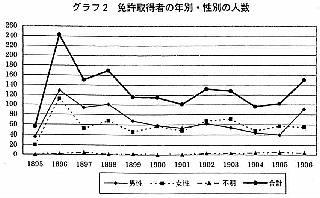 | 『教派神道の形成』弘文堂(平成三年三月発行)で大きく神理教の紹介をして頂いた、國學院大學の井上順孝先生が國學院雜誌に研究論文を掲載されました。 神理教が独立してからの、教師の全国分布などを二年ほど前に調査に来られましたが、そうしたものの一つのまとめとされたようです。原文を尊重したため、御教祖の氏名に尊称をつけていません。 『國學院雜誌(第104巻 第11号)より転載しています。』 教派神道の地域的展開とその社会的条件 井上順孝 − 神理教の事例を中心に − 三 初期神理教の教勢 神理教は明治中期から後期にかけて信者数が増え、教師数もかなり安定した割合で増加していく。『千代田日誌』のなかで、経彦は神理教は分教会五〇と信徒五〇万人にのぼると述べている。一派独立する少し前の一八九〇年段階での話である。また、神理教の幹部であった藤江伊佐彦はその著『教祖様の面影』のなかで、一九〇六年の経彦死去の時点で、門人約七千人、公称信徒数は一五〇万に達していたと述べている。 一派独立してからの公称教師数は内務省に報告されているので、毎年の『内務省統計報告』によってその推移が分かる。神理教が一派独立した一八九四年から、一九一二年までの間のデータがこの統計によって得られる。これをもとに男女別の教師数の推移を示したのがグラフ1である。 なお、神道教派は、一九一三(大正二)年に内務省宗教局から文部省宗教局へと管轄が変わり、内務省の統計数値はなくなる。以上のことから、一派独立の時点で各地にすでに相当数の信者及び分教会が存在していたことが分かるが、一派独立する以前の信者数や教師数の変化状態を詳しく知れる資料はない。これに対し、一派独立以後の展開に関しては、信者の地理的拡大その他の状況を考察する上で参考になる資料が存在する。これによって、一派独立以後、どの地域にどれくらいの数の布教師的な人物が存在したかが明らかになり、神理教全体の展開を知るきわめて重要な手がかりが得られる。 それは現在の神理教大教庁に保管されている、一派独立以来の禁厭祈祷等の免許(「巫神占免許」)を得た教師の名簿である(以下「免許名簿」と表記する)。 「巫神占」の免許であるので、これを取得した者は、佐野経彦が教えた禁厭法や神理教独特の占い法、その他を信徒に対して行うことを許可される。「免許名簿」には、そうした人物一人一人の本籍地、住所、紹介人、任命年月日、生年月日、その他の情報が記されているのである。 この名簿のうち、一九六〇年代までの分について複写を依頼し、許可が得られたが、その間に合計約一万人近くの人物に関するデータがある。個人情報が記されているので、個別の情報を公にはできないが、データを数量的に分析することについては神理教より了承を得ているので、この名簿をよりどころにしながら、初期神理教の信者の地域的展開について論じてみたい。 本稿では得られたデータのうち、経彦が生存していた時代の展開について扱うことにする。宗教運動の展開において、創始者の在世中と没後では大なり小なり運動の変化が観察される。創始者の死去は一つの節目になる。神理教の場合も、経彦の没後教師数はわずかであるが減少に転じている。経彦時代を神理教の展開における一つの区切りとしてみなす立場から、データの分析を行いたい。 一八九五年から佐野経彦が死去する一九〇六年までの一二年間に任命された数を調べると、一、五六〇名にのぼる。男性が八三〇名、女性が七〇一名、性別が判別できないもの二九名である。これを年別、男女別に分けて示したのがグラフ2である。 内務省に届けられた教師数のデータと比較すると、教師の数よりも免許を得た者の数が七〇〇人近く少なくなる計算だが、女性に限ってみれば、逆に免許取得者の方がやや多い。教師では男女比は大きな差があり、男性が八割強を占めるが、免許取得者では半々に近い。これからすると、免許を得ても教師ではないものもいることになるが、数から判断すれば、どちらかといえば教師より厳しい資格であったと考えられる。第一号は一八九五年九月一七日任命となっており、一九〇六年までを平均すると、毎年おおよそ百三十名程度が免許を得ていることになる。一派独立した直後は数値の変動は大きいけれども、その後は激しい変動は見られない。 |