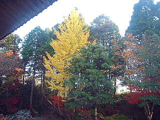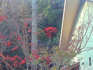 | ============================================================== <平成14年11月29日(金)> ============================================================== 前回、葉の落ちた紅葉の向こうに、また赤く燃えるようなハゼの木が竹林の緑の中に見える