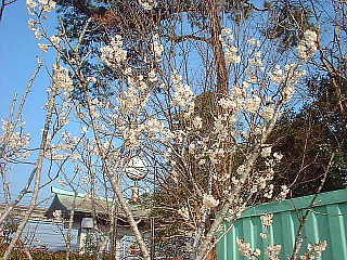| 大教殿に地元の蜷川さんから頂いた、彼岸 桜(ひがんざくら、と私たちは呼んでいます が、もしかすると別種{緋寒桜の一種}かも) が、もう花を咲かせています。 |