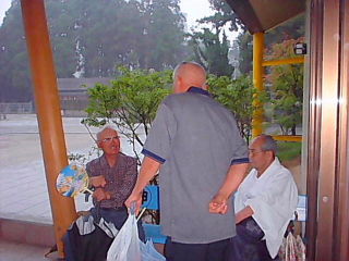 4.もの凄い雨を尻目に、時間つぶしの歓談をする管長様と総代さん。