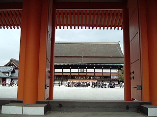 御帳台は皇后の着かれた処です。 左近の桜(さこんのさくら)「左前」 紫宸殿の東側にあります。 3.承明門から紫宸殿(ししんでん)を見渡します。