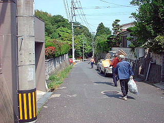 | 清掃後、帰る職員の後ろ姿 | 駐車場に移動された大きな木アカシアかな? |