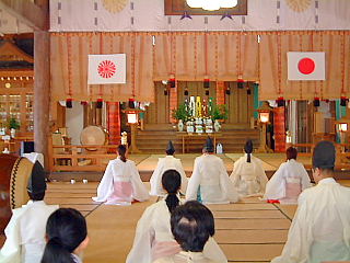 | 大教殿西の廊下から遙拝 | 座後列拝(管長1、巫部・立元2、末若・古川・甲木3) |