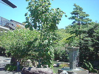 | 噴水は、現4代管長様就職50年(平成10年4月)の記念に、福山教会が 建てられたものです。 噴水すぐ左手の高い木がアオギリです。 |