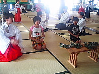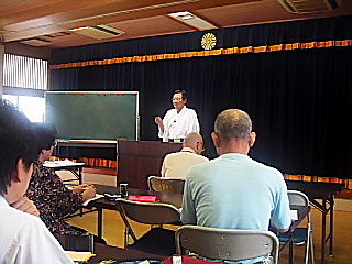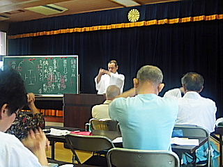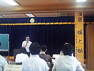 第57回夏期講習会は、無事全日程を終了し、先ほど皆さん本院を出られました。 (3日目1限、橘田先生の清祓の授業です) (3日目3限、松岡課長心得の御神宝の授業です) (3日目4限、三角局長の初めての神理教の授業です) (京都洛北教会の美人姉妹の食前の言葉です) (3日目は午前中に”命の旅博物館から神州太鼓教会の子ども達も加わりました。 午後は祭式にも参加しました。 写真左は小路教会長です。 2日目の10:00〜子ども対象の授業も受け持って頂きました) (4日目、瀬戸局長の神理学の講義の後、各班及び青年部の皆さんによる研究発表や体験談がありました。 最後の授業は、矢野大和先生の授業で泣き笑いをしました) (管長様から終了書を頂き、教師の辞令も2人交付されました) (最後は恒例の神理教の歌を声を合わせて歌いました) (神理の会の皆さんは、昨日の青年部総会に続き、今日は納骨殿前の石段をゆっくりあがれるようにして頂きました) >行事予定< 毎月1日6:00より月例祭、16日16:00より教祖祭 1)8月13〜15日(土〜月)は穂見祭の巡拝。 本院から離れた処は7月から伺っています。 穂見月(8月)の祖先祭りは、日本人の良俗です。 宗旨が仏教などのご家庭も、本教の教会長や教師に御願いして神式でお祭りされて下さい。 ご先祖は、大喜びで和まれます。 2)8月16日(火)は11:00より本院大教殿で、穂見大祭があります。 皆様奮ってお参り下さい。 本院に鎮まる皆様のご先祖の幸魂と和魂に、今の幸せと感謝をご報告下さい。 3)8月27・28日(土・日)は、未来委員会です。 本教発展のための、いろんな御意見をお持ち帰り頂きますようお待ちします。 |