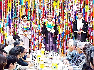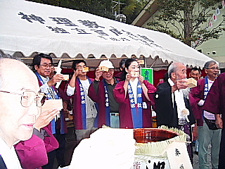 | この度の新潟地震は大変でした。 寒くなる時に被災された方は、大変ですね。 新潟県には教会はありませんが、関係者がいないかと心配です。 青年部では見舞金を出しますし、婦人会でも検討しているようです。 長引くようですから、本院に義捐金など送って頂ければ、取りまとめてお送りします。 <奉仕生往来> ・大分県の光金稲荷教会の菅ひとみさんが、大祭前から1ヶ月ほど勉強に来られました。 勉強もされたし、お手伝いもたくさんして頂きました。 お疲れさまでした。 ・広島県の福山教会の鶴目信弘さんが、11月1日から平成18年3月までの予定で勉強に来られます。 >行事予定< 毎月1日6:00より月例祭、16日16:00より教祖祭 1)11月3日(水・祝)筆者の小学校の恩師の同窓会兼喜寿祝い。筆者が出向します。 2)11月7日(日)福山教会秋季大祭。筆者と瀬戸局長が出向します。 3)11月8〜11日(月〜金)皇居清掃奉仕。巫部恵理を団長に32名で伺います。 4)11月13〜15日(土〜月)北海道の北門神社教会の改築落成報告祭です。筆者と松岡課長心得が出向します。 5)11月14日(日)稲荷宮教会の秋季大祭です。瀬戸局長が出向します。 >行事報告< 1)10月8日(金)教派連理事会。 神道大教で新しく管長となられた、大阪の尾立聖兆様とご挨拶出来ました。 同教団は当初、教派神道の教団や神社神道以外の教会教師を取り扱う明治政府の事務機関でしたが、12派が独立した後残りの教会・教師を束ねて成立した教団です。 2)10月17日(日)西日本新聞主催の合同金婚式が、北九州市リバーサイドの芸術劇場でありました。 100組以上のご夫婦が参加されていました。 健康が一番ですね。 <秋季大祭> 素晴らしい天候に恵まれ、沢山の皆さんにお帰り頂き、独立と御教祖生誕の締めのお祭りを行うことが出来ました。 15日の夕刻には、管長様の金婚式と副管長の就任祝いをして頂きました。 本当に有り難うございました。 (お祝いの鶴のレイや鶴の花束を頂きました。 後ろの鶴の数は何と3万羽を越えるそうです) (神州太鼓教会の祝い太鼓を始め、大津教会のお子さんを加えての年齢不詳演技団の楽しい催しなど、沢山の方が趣向を凝らして下さいました) (青年部の皆さんも楽しそうに見えますが、大変な縁の下の力持ちでした) まだ写真がありますから、次の機会にも紹介します。 <津山教会の秋祭り 10月18日(月)> 本院に引き続いてのこちらも、大変な好転を戴きました。 翌日には台風が来るということになりましたが、お陰を戴いた感謝します。 (教会の稲荷神社の前で、御神輿に神意を伺っています) (教会の本殿の前で、御神輿に神意を伺っています。 この他、山の上の御教祖の石碑をお鎮めしている明星苑や、明星幼稚園の園庭や、その行き帰りで次々に神意をお知らせになります)